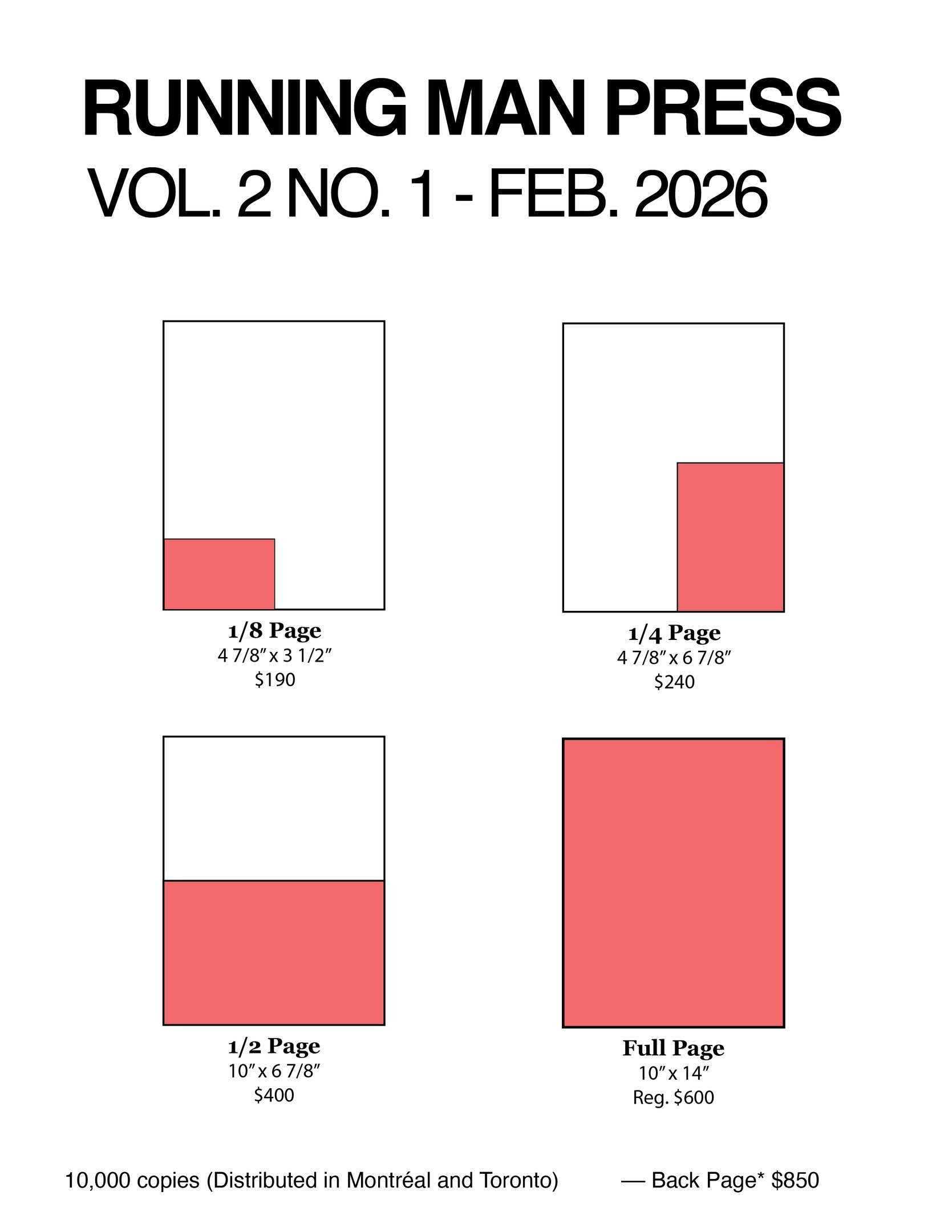 Running Man Press is a free quarterly paper delivered to cafés, music venues, universities and public spaces in Montréal and Toronto.