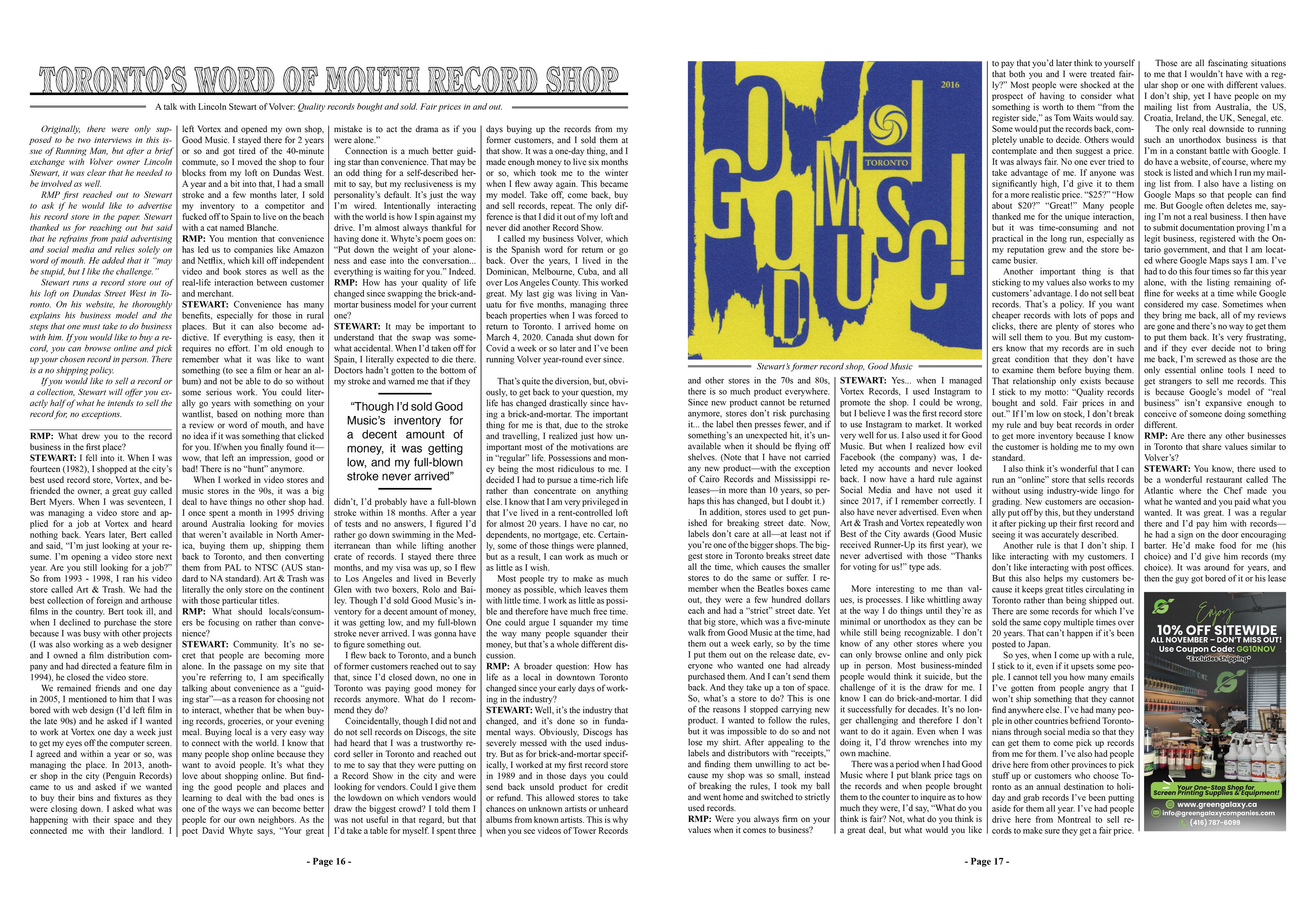 Originally, there were only supposed to be two interviews in this issue of Running Man, but after a brief exchange with Volver owner Lincoln Stewart, it was clear that he needed to be involved as well.