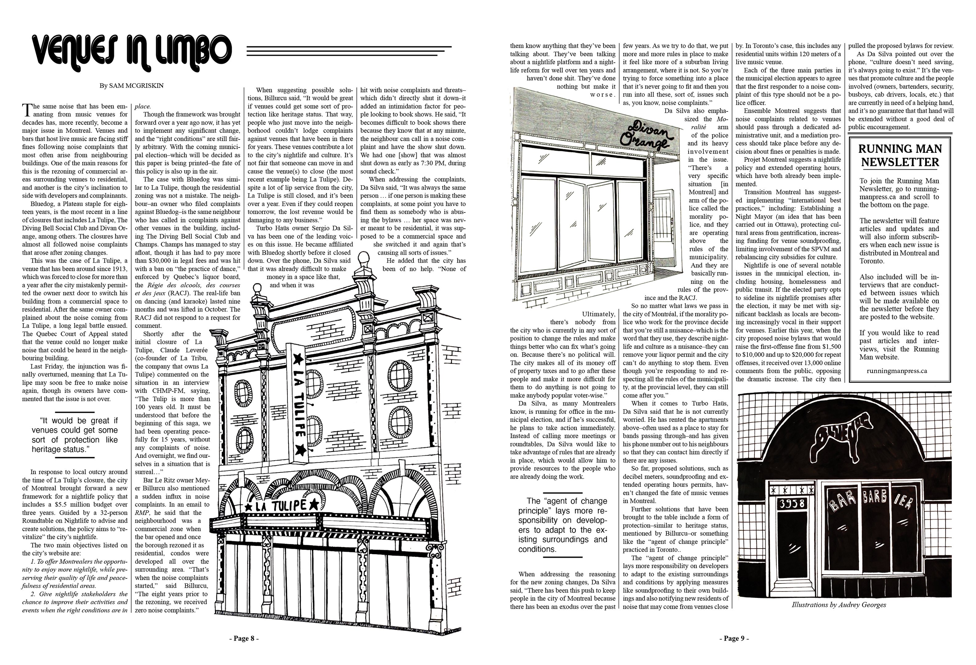 Transition Montréal suggested implementing “international best practices,” including: Establishing a Night Mayor (an idea that has been carried out in Ottawa), protecting cultural areas from gentrification, increasing funding for venue soundproofing, limiting involvement of the SPVM and rebalancing city subsidies for culture.